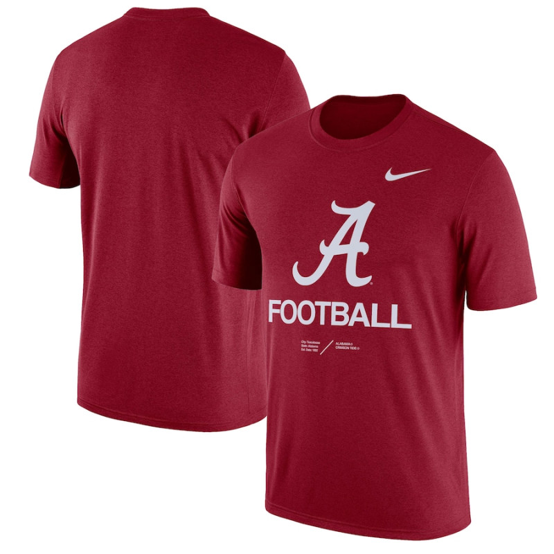Enjoy a casual display of your unshakable Alabama Crimson Tide spirit by adding this Nike Football Legend T-shirt to your gear collection. Along with a bold Alabama Crimson Tide graphic across the chest, it features a bold ''football'' wordmark just below, leaving no doubt what you get fired up for. Plus, the crew neck design makes it easy to pair this laid-back tee with your go-to cap for a double dose of team devotion.